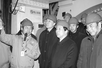 图为江苏省省委书记梁保华(前左三)、省长罗志军(前左二)视察南京长江隧道工地。 |