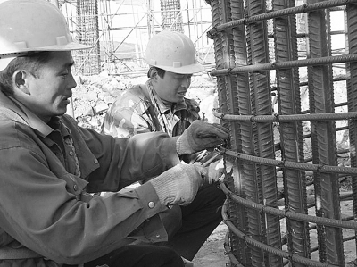 距北京奥运会还有120多天,由十七局集团等15家承担施工的北京市西六环公路良(乡)寨(口)段奥运配套工程,现已进入收尾阶段。图为两位农民工在认真地绑扎钢筋。 申宝华 摄