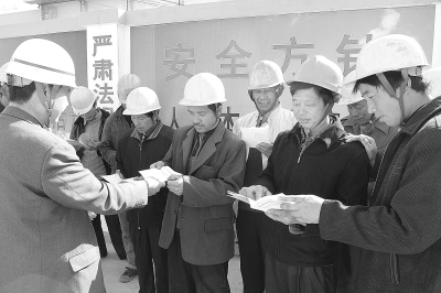 奥运临近,中铁建设集团33项目部把安全生产教育作为管理的重中之重。他们根据自身情况,编制了一套《中铁建设集团公司施工现场作业人员安全知识手册》,《手册》以问答形式,将现场操作规章制度贯穿其中,简单易懂,受到农民工的热烈欢迎。 徐 春 王维宇 摄