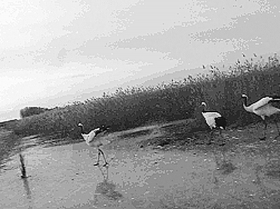 几只孤零零的仙鹤站在芦苇边。它们是被放养的几只。从它们身上可以看出,曾几何时,生活是多么美好。而今几排铁笼豢养了这濒危的生灵。惟有如此,才可以保护其生命。在蓝天碧水绿地鲜鱼和生命面前,它们被迫选择苟且偷生。