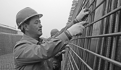被团中央命名为“青年岗位能手”称号的十八局集团二公司关玉虎,练就了一手钢筋绑扎绝活,当走上管理层岗位后,他仍然不忘带徒传艺。温福铁路鳌江特大桥是公司的创优工程,为使工程达到内实外美和创优目标的实现,他无私地将钢筋绑扎绝活传授给青工。图为关玉虎为钢筋绑扎工传授钢筋绑扎技艺。 赵江平 摄