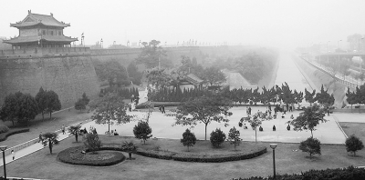 那晚,我下榻于西安古城东门外一个叫香港大酒店的宾馆,与东门的城楼近在咫尺,约深夜时分,从那城墙下传来一声声秦腔,让我听得入迷,不得入睡。于是,便披衣下床,循声而去。我发现在那城墙之下,护城河之内的环城公园里,在地灯朦胧的树丛间,三三两两的人群顺城墙而去,唱的、跳的、拉的,应有尽有。有秦腔、有京戏、有豫剧,那优美的唱腔,拂掠过护城河的清波,那护城河的清波亦滋润着声声唱腔,而古老的城墙便在那唱腔的抚慰下进入了梦乡。