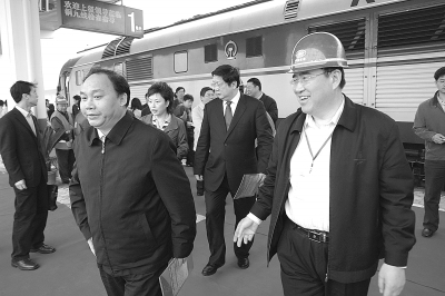 4月11日上午,江西省副省长凌成兴(左一)在十九局集团董事长左春文(右一)等陪同下,到铜九铁路彭泽车站调研,对十九局集团坚持高标准科学施工,提前完成任务表示十分满意。 李广洲 摄