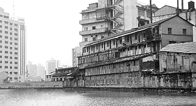 苏州河是由西向东流入黄浦江的。但上海的都市化则是从东头的河口开始,溯流向西延伸的。过去,沿河两岸曾经错落地散布着农田、湿地、芦苇、沟汊,冷僻的地方野气又重又浓,“秋风一起,丛苇萧疏,日落时,洪澜回紫”。可是,在都市化的铺展面前,这些自然的东西已不能与膨胀的经济共栖,它们不得不大踏步地撤退。在它们腾出的空间里,参差立起了礼查饭店,百老汇大厦、文汇博物馆、新天安堂、光陆大戏院、自来水厂、河滨大楼、圣约翰书院等等各擅胜场的建筑,使苏州河日甚一日地被两岸的社会经济构造所笼罩。这些楼群临水而立,时人誉之为“连云楼阁”。它们以商业繁华为扩展中的上海画出了迷人的天际轮廓线。
