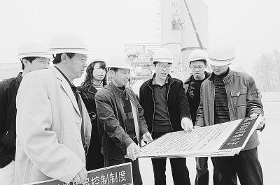 京沪高铁十二局集团八项目部,严格按企业文化标准建家建站,墙上规章差一字也不行,混凝土罐安装差一丝也要调试,场房质量差一点也不放过,计划目标差一天也抢夺,以快速度,高起点完成建家建站任务,受到领导的称赞。图为项目部经理梁建忠、书记陈英奇和工程技术人员现场严把关。 安剑承 陈英奇 摄