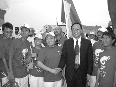 图为北京市副市长、北京奥组委执行副主席刘敬民(右二)与十八局集团阿曼公司职工,手拉手共同感受奥运火炬在阿曼成功传递的喜人场面。 阿 苏 摄