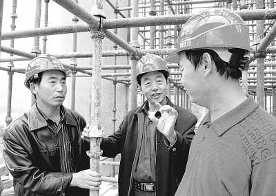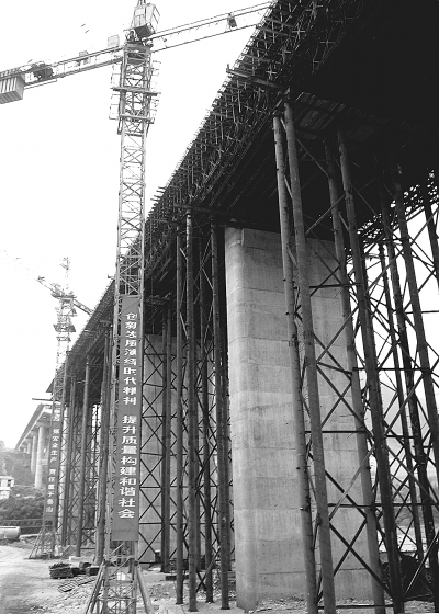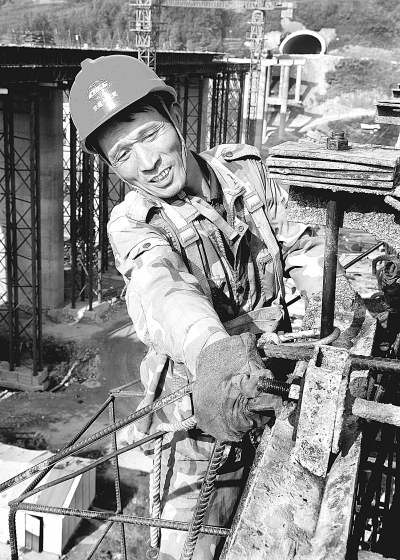 右图:正在施工中的中村一号桥。中图:该桥梁一公司管理人员在现场严把捆扎桥面钢筋质量。左图:该桥梁一公司的施工人员正在桥面施工作业。 杨春杰 摄