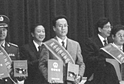 十一月二十八日,在南水北调北京段工程建设总结表彰大会上,十六局集团北京轨道交通工程建设有限公司党委书记杨哲峰(中)获得由北京市政府颁发的优秀建设者金质奖章。韩 宇 摄