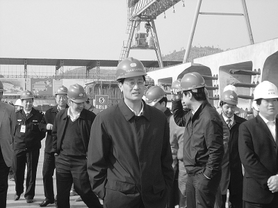 4、四分部经理黄天照(左一)、六公司董事长陈治波(右一)、总经理卢贤存(左二)陪同集团公司董事长瞿观鄞(左三)、副总经理郑余近(右二)检查工作