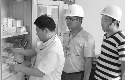 炎热的夏日到了,防暑降温成为施工一线迫在眉睫的一项工作。在搞好施工生产的同时,职工的身体健康、个人安全也尤其重要。十七局集团四公司将工地职工的身体健康作为安全工作的一项重要内容来抓。图为该公司项目部卫生所的值班医生正在给职工发放防暑药品。杨 涛 摄