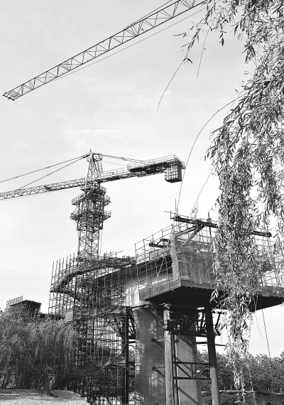 全长10公里的京石铁路客运专线滹沱河特大桥,沿途多处跨越铁路、公路、河道,悬灌现浇梁和转体连续梁多,是全线重难点工程之一。十二局集团三公司在施工中注重发挥科技优势,攻克了多项技术难关。图为跨石太高速公路悬臂连续梁施工现场。