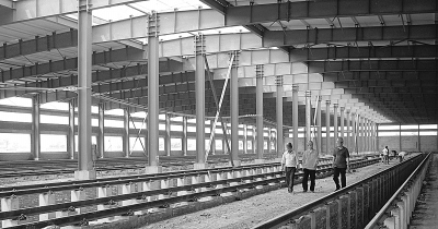 由十五局集团六公司承建的天津地铁曹庄列检库主体工程于日前完工。这座轻型门式钢架结构列检库面积为8854.5平方米,可同时容纳10台地铁列车的存放、检修。图为设有10股轨道的曹庄列检库大厅。 丛建伟 摄