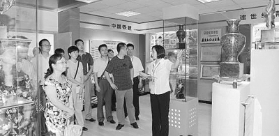 十七局集团四公司在机关大楼专门装修设置了公司荣史展示厅。该展示厅共收集铁道兵以来公司的各项荣誉奖章、锦旗、奖状和奖杯等文史档案、图片资料310余件,集中展示了公司的施工成绩和精神文明创建成果。图为该公司工作人员正在向重庆市北部新区30家单位代表介绍公司荣史展示厅情况。杨 涛 摄