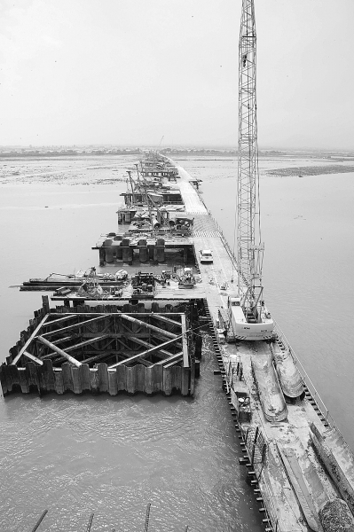 长沙湾特大桥位于广东省汕尾市海丰县,全长14.07公里,是厦深铁路第二长桥,先后跨越22个自然村、4条公路、17条河道及3.5公里的鱼塘,施工难度大,环保要求高。十八局集团二公司参建员工精心组织,科学施工,确保了施工生产顺利进行。图为最艰难的长沙湾特大桥海中墩展开全面施工。 曹战锋 王忠霞 摄