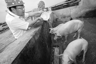 滨海站项目部项目经理金学松(左)和党工委书记范成员(右)把食堂剩粥倒入食槽内喂猪。