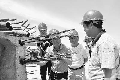 十七局集团五公司营双项目部把质量工作放在首位,严格按照施工规范和验收标准进行施工,做好质量控制关键点的管理工作,落实质量责任,开展质量控制关键点QC小组活动,做到施工程序化、工艺标准化、操作规范化,赢得了业主和监理单位的广泛好评。图为项目部在进行每月一次的质量职责制的落实情况检查。 郭 靖 摄