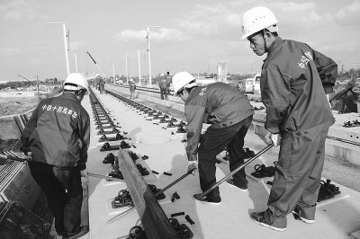 11月5日下午,十四局集团五公司铺轨工人在成绵乐客专旌阳站铺设500米长钢轨,标志着我国西南地区首条开工建设的高速铁路成绵乐客专全线进入攻坚收尾阶段。担负铺轨任务的五公司需铺轨528.25公里,目前已完成125公里。 刘福昌 摄