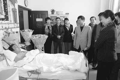 北京红十字会副会长刘娜(右一)、中铁建设集团副总经理陈有忠等看望正在捐献中的李杨霖。陈 逸 摄