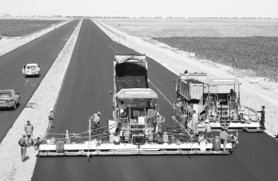 二十一局集团一公司在新疆奇台至木垒高速公路工程施工中,坚持开展“三个一”(每周一课、每半月一考、每月一实作演练)活动,确保工程质量,荣获新疆交通建设管理局2011年度“筑路先锋杯”劳动竞赛先锋杯、安全杯、质量杯、进度杯、创新杯5项荣誉称号,以及2013年交通运输部“平安示范工地”荣誉。图为摊铺沥青作业。