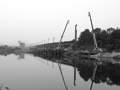 为此,三公司与业主协商后,在护潭河上搭建钢栈桥近300米,将10多个钢围堰连成一线。这种栈桥宽9米,工人和施工车辆往来便利,桥下的鱼儿畅游无阻,河边更不乏垂钓休闲的市民。