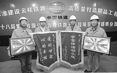 5.十八局集团六公司云桂项目经理曹金炉(右二),总工刘向东,副经理肖吾毛、陈海龙等手捧锦旗、奖牌。