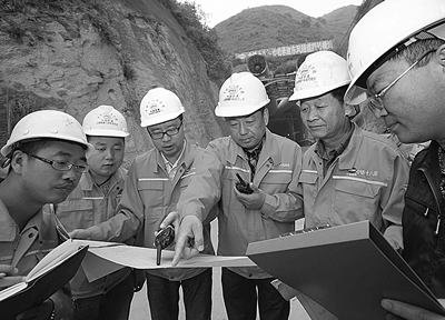 4.十八局集团六公司云桂项目经理曹金炉(右三),总工刘向东,副经理肖吾毛、陈海龙、柴海成、李文学等在研究施工方案。