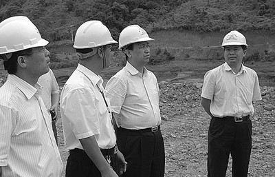 2.十八局集团总经理彭仕国(右二)集团副总经理兼云桂项目经理邓勇(右一)在云桂项目常务副经理杨继明(左一)等陪同下检查工地。