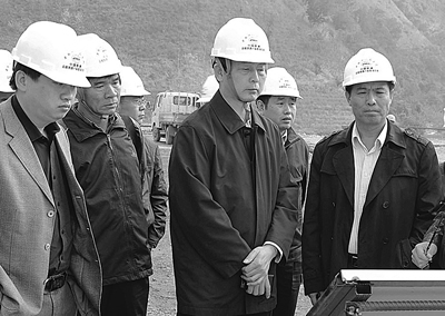 1.十八局集团董事长、党委书记郝趁义(右三)在集团副总工兼安质部长刘金良(右二),云桂常务副经理杨继明(右一)、党工委书记矣成辉(左二)、总工樊秋林(左一)陪同下检查工地。