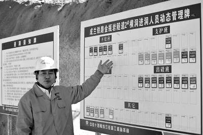 十四局集团担负施工的成兰铁路第11合同段有21公里隧道,共设8个洞口,每个洞口都设置了进洞人员登记牌,工人进洞前将自己的登记牌翻成红颜色的,出洞后再翻到蓝颜色的,现场作业的情况一眼就能看清,加强了施工人员的动态管理。图为一分部安全总监陆西堂在现场介绍人员动态管理情况。刘福昌 摄