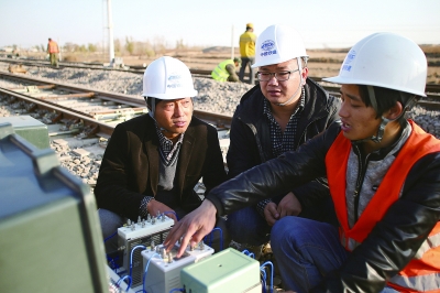 十六局集团电务公司针对承建的集通铁路“三电”工程及通信、电力迁改项目实际情况,狠抓既有线施工现场安全。图为项目经理陈毕贵(左)在金家店车站检查轨道电路施工。 本报记者 成海忠 摄