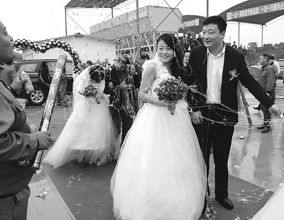11月2日,在河南商城县境内的国家重点工程宁西铁路南阳至合肥段增建二线工程建设工地。二十二局集团哈建公司的7对青年人也收获了甜蜜的爱情果实。婚礼一结束,他们就又投入到紧张的施工大干中。王秉良 钟善良 摄