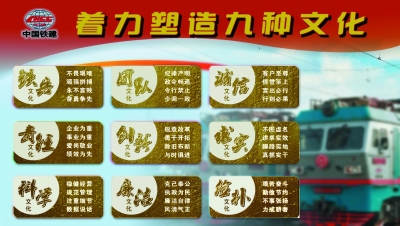 包括铁兵文化、团队文化、诚信文化、责任文化、创新文化、求实文化、科学文化、廉洁文化、俭朴文化在内的九种文化,无疑是中国铁建企业文化在新的发展时期的新成果,是对中国铁建先进企业文化的高度概括和发展。