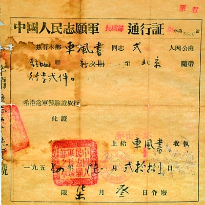铁道兵团及解放战争部分战役胜利纪念章(捐赠者 张寿卿 马鹏飞 曾建成) 中国人民志愿军长城部特别通行证(捐赠者 车风书) |