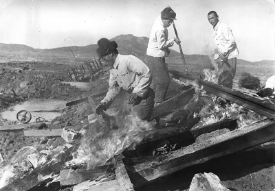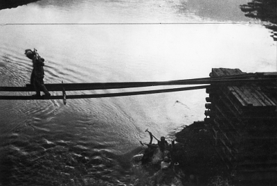 ①解放战争中:为了辽沈战役的胜利,战士们踏着悬空的单轨抬运钢轨抢修大桥。