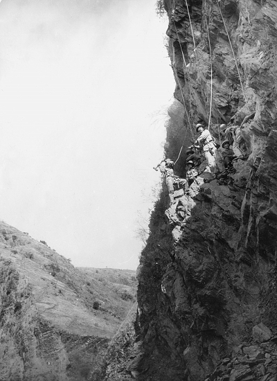 ③社会主义建设中:铁道兵战士修建成昆铁路时,不畏艰险,开山筑路。