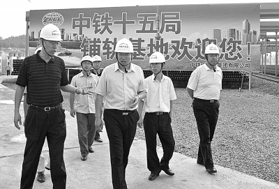 六公司执行董事、总经理薛学勇(右三)陪同十五局集团董事长、党委书记武宪功(左一)到一线检查工作 |