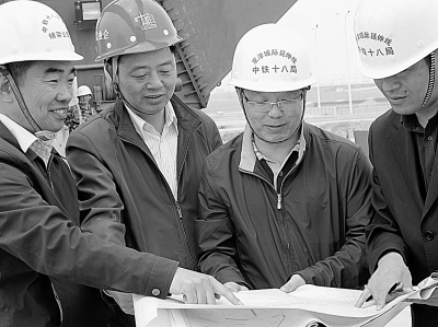 十八局集团京津城际延伸线指挥长钟兴兵(右二)、五公司副总经理李楼玉(左二)在现场研究方案。 |