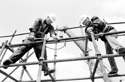 十二局集团一公司在东北新建沈西工业走廊火石岗至渤海铁路工程施工中,针对高空作业风险大的特点,要求职工“安全警钟要常鸣,三检一刻不放松”,确保施工生产稳健推进。图为职工正在立脚手架。 本报记者 武 羽 摄