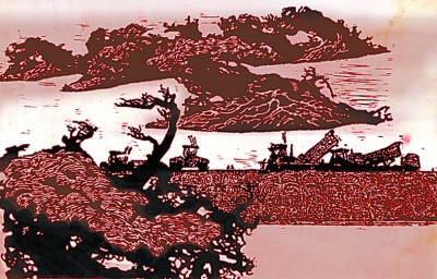 李仕兵 《戈壁筑路》 版画 45cm×60cm |
