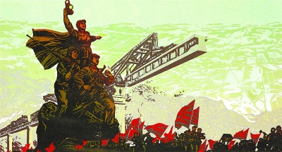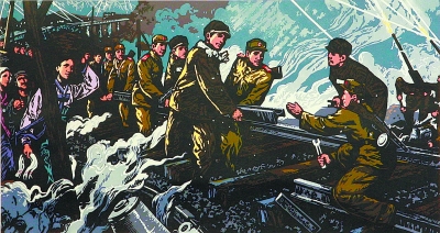 黄嘉善 张衍海等集体创作 《志在四方组画》(上:前进,人民铁道兵 下:打不烂,炸不断) 版画 45cm×90cm×2