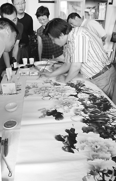 十五局集团重视企业文化建设,培养出了中国美术家协会会员李建设、吴明科等一批书法、绘画艺术骨干,在河南省、中国铁建、集团公司组织的各类书画比赛中获得多个头奖。最近,该集团成立了职工书画协会,丰富职工的业余文化生活,促进企业和谐健康发展。图为李建设现场作画。