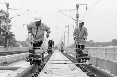 担负合福客专安徽境内正线427(双线)公里铺轨任务的十一局集团三公司,以每天近10公里的速度,将500米长轨向前延伸。图为工人们在进行长轨紧固作业。徐云华 摄