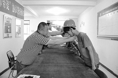 7月24日,在二十五局集团五公司山西中部引黄12标新员工岗前安全培训班上,项目部经理杨志文为徒弟示范安全帽的正确佩戴方法。