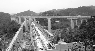 截至11月4日,二十三局集团六公司在沪昆客专6标无砟轨道施工中,已开累完成49.3公里,完成施工总进度的83.9%。图为位于贵阳近郊、正在施工中的柿花树特大桥(下中部)。段绪江 摄