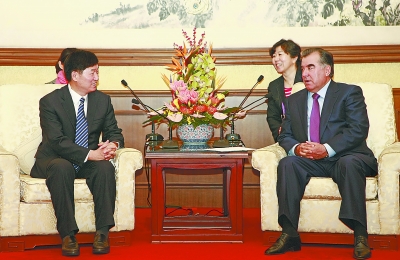 本报北京11月14日讯(记者王 莹)11月7日上午,中国铁建总裁张宗言一行在北京钓鱼台国宾馆,拜会来京参加APEC会议的塔吉克斯坦总统拉赫蒙。双方就加强基础设施建设合作情况深入交换了意见。