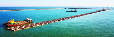 港航局集团三公司日照钢铁项目部调度船舶在黄海海域实施沉箱安装作业。这些安放于海底的沉箱是构成重力式码头的重要组成部分,其单体长19.95米,宽14.25米,高19.1米,从空中俯瞰,露出海面的沉箱顶端仿佛构成一段海上长城。郭 超 摄