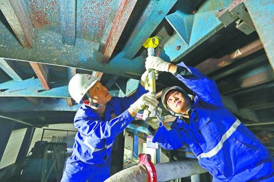 中铁十一局在京沈客专隧道施工中,为确保隧道衬砌质量,成功研发了隧道二次衬砌拱顶带模注浆成套施工技术,有效保证了隧道衬砌质量。图为施工人员在安装注浆管连接套件。