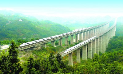 11月28日,由中铁十二局参建的新建重庆至万州高速铁路建成通车。该线全长247公里,设计时速250公里,跨河川,越峻岭,使重庆到万州仅需1个小时,通车后将对拉动沿线经济起到积极促进作用。图为动车飞驰在由中铁十二局承建的御临河特大桥上。本报记者 武 羽 摄