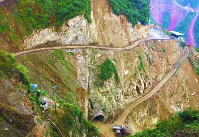 中铁十六局承建的,位于青藏高原和云贵高原向四川盆地过渡的斜坡地带,重峦叠障,峰高谷深。为尽早实现当地百姓的“公路梦”,参建人员如“蜘蛛侠”一样,登高攀岩进行施工。图为现场作业情况。 檀少贵 摄