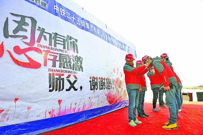 “师父,您辛苦了。”4名身着工装,头戴安全帽的年轻人同时向自己的师傅深深鞠一躬。这是近日在中铁二十五局五公司潍坊港疏港铁路工地现场举行谢师仪式上的一幕。在海风呼啸的工地现场,这些今年新入职的大学毕业生,以最朴实的方式感谢师傅近半年来为培养自己所付出的心血。张照朋 摄